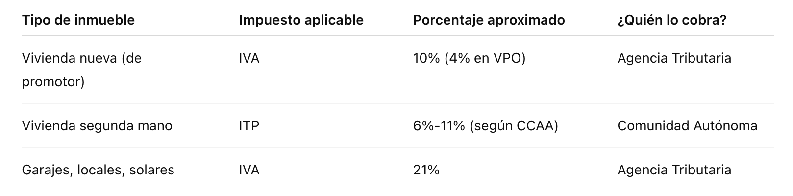 - Ejemplo práctico: si compras una vivienda nueva de 250.000 €, deberás pagar un IVA del 10%, es decir, 25.000 € adicionales.